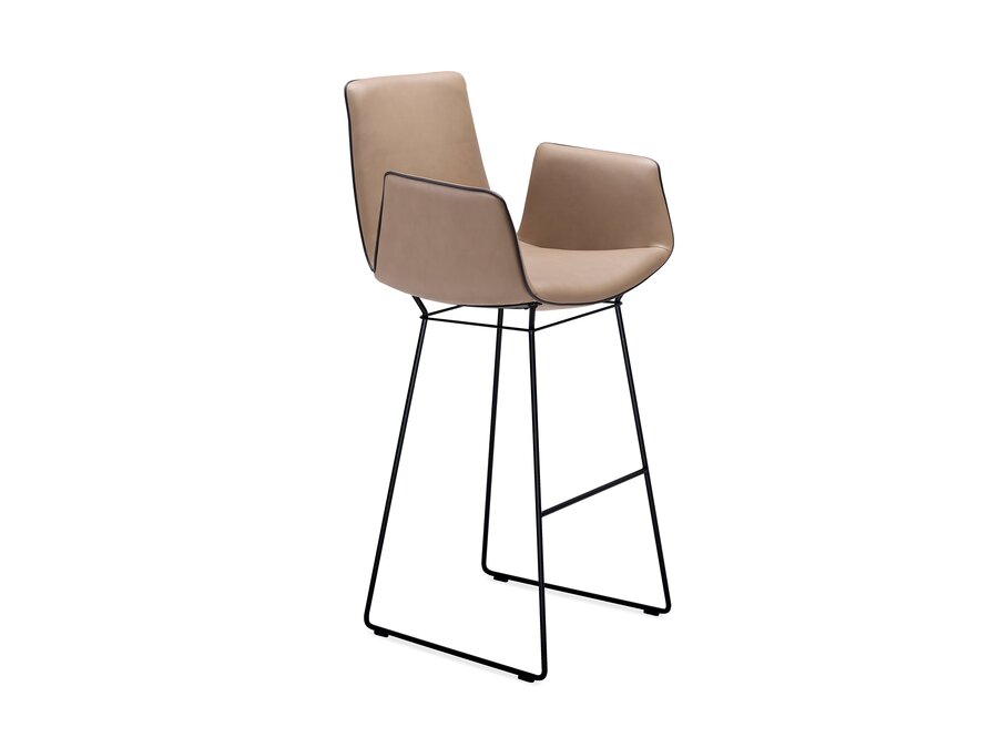 Каркас сиденья полностью обтянут ценной тканью или элегантной кожей, а передняя и задняя часть могут быть покрыты различными материалами, что придает им неповторимый вид. Барный стул Амели доступен с элегантной проволочной рамой или вращающейся опорой с регулируемой высотой, оба с порошковым покрытием и доступны во многих цветах. Окантовка визуально подчеркивает форму сиденья и спинки, еще больше подчеркивая единые линии всего дизайна.