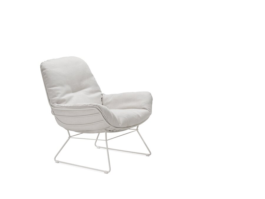 Филигранная, устойчивая к атмосферным воздействиям рама имеет плавные линии, создающие каркас стула. Съемные подушки могут быть исполнены в различных тканях, в том числе водоотталкивающих.