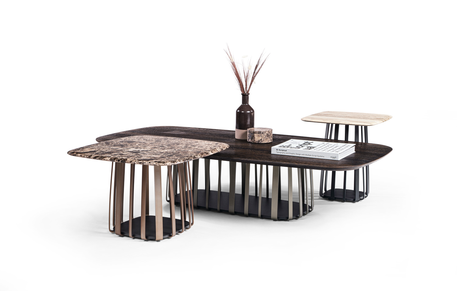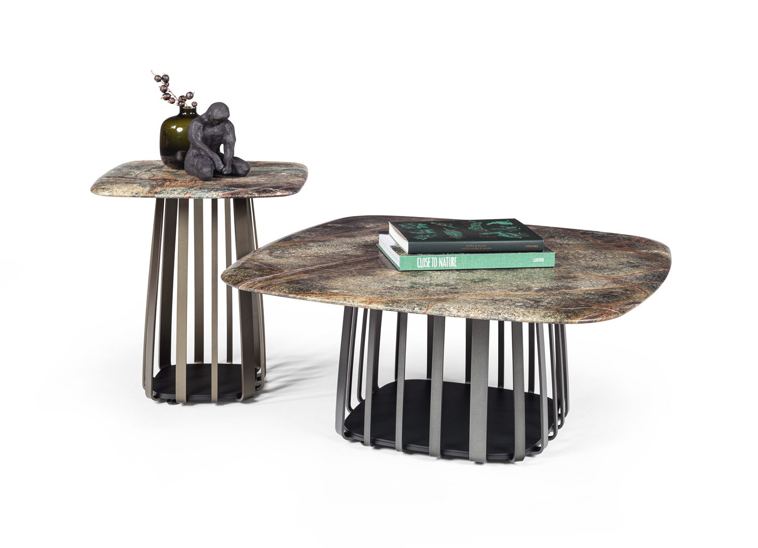 Дизайнеры сочетают здесь довольно ярковыраженные материалы, такие как: дерево, камень и металл, создавая чувственный круглый стол. Круглая столешница из массива дерева опирается на слегка изогнутые металлические стойки разной ширины.