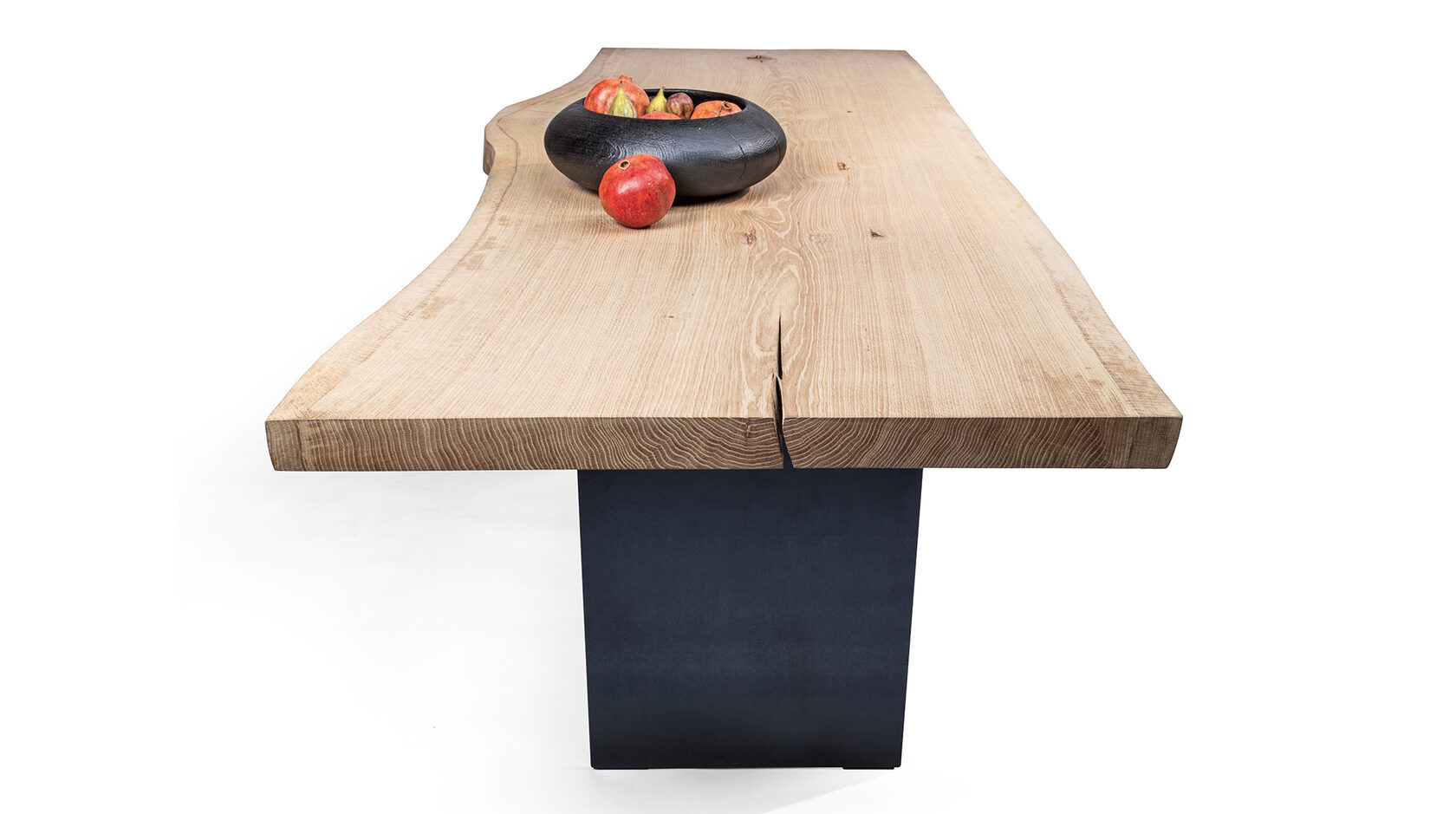 «Обожжённая» столешница прекрасно дополняется рамой из необработанной стали. Обжигание используется, чтобы выдвинуть на первый план внутреннюю силу дерева.